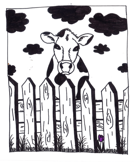 Eight cows graze in a painting on my wall. A stuffed cow sits in my bed. In a picture frame, eleven cows line up, silhouetted to a Nebraska sunset. Four cows, in ornament form, hang from a little white Christmas tree. And on a postcard resting on my shelf stands one cow, drawn, in black and white, by a special freckled girl. The cow in this drawing stands behind a wooden picket fence with its body and head attuned to whoever is beyond. Its black spots transcend into the sky with puffy scalloped clouds. Two years ago I had no cows. I drank almond milk and ate no red meat.