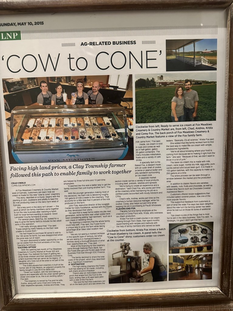 The girl behind the register at Fox Meadows Creamery says she has never been to the 80 cow farm next door, which supplies all of the ice cream for the facility. Once a year the owners give an employee tour, but she was out of town that day. There are cow prints and cutouts on the walls varied with several cow facts, like how calves can walk only an hour after birth. I sit down to eat a sandwich staring out the window through the covered porch, across a field and to the farm beyond. Everything truly revolves around the cow. People work the fields to feed the cows to produce the milk to make the ice cream to serve the people who will on any given Friday night wait in an hour line just to eat it. After finishing up I ride out by the Fox Meadows farm to see if I can talk to anyone. Even rode by twice, but no luck.