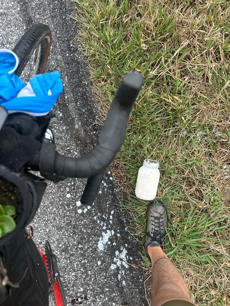 Being curious of everything cows becomes a matter of disciplined thought, against the desire to stay warm and rush home. As I near the river I begin regretting things I never asked Paul at his farm. If I’m supposed to write about this I should have recorded more senses. Felt the cows. Smelled the air. Heard the rustling of the calves. I begin to grow down on myself as I’m riding up a hill, swaying back and forth with each pedal stroke and holding my eyes on the pavement before me, when a white reflection crosses my periphery in the grass. A minute later the curiosity building from the object finally causes me to turn around, where at once, a clean vessel, a mason jar, filled with what appears to be raw milk, rests along the roadside. Putting the jar up to my face shows an alabaster haze with atmospheric depth, and makes me wonder if this has any ties to naming the “milky way.”